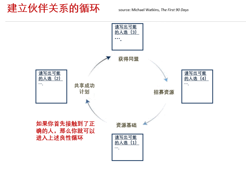 为建立广泛的伙伴关系,新干部可以先识别和管理以下四类利益相关人(每一类列出可能的3个人选),按正确的顺序寻求潜在支持,说服“可说服者”,并使之成为支持者;利用现有的社会和人际关系,并通过日常的对话沟通加强这些关系,打造人际关系的良性循环。