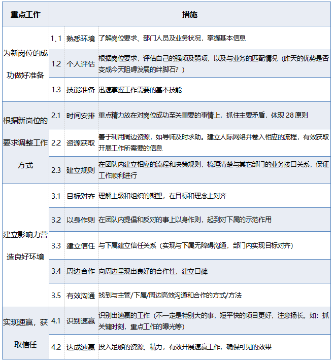 基于过渡期的工作和对新岗位的深入了解,此时新干部可以启动战略思考,并通过讨论和沟通,在团队内部上下对齐,让关键系统保持一致。