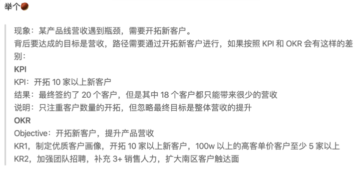 可以看到,最大的区别还是在于KPI本身把数据本身当做了目标,而OKR是围绕着提升营收这个目标将数据当做评估工具,用来证实自己是真的完成了Objective。